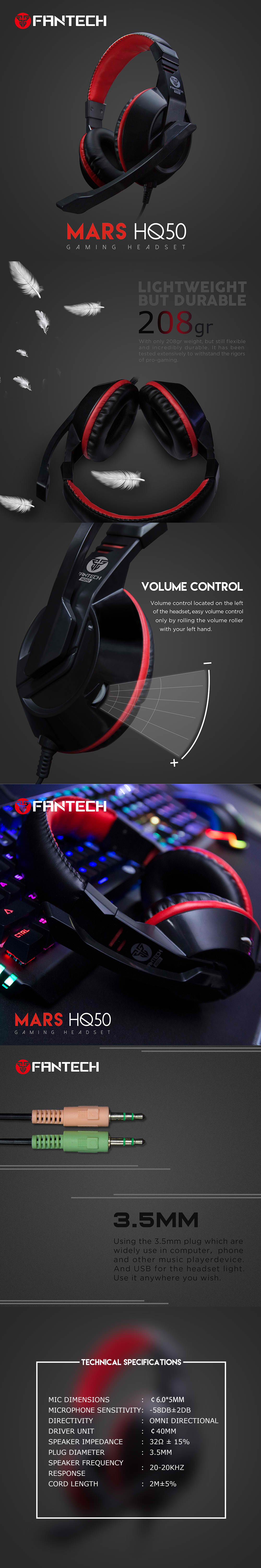 FANTECH HQ50 Mars Gaming Headset has a Mic size of 6.0*5MM and a sensitivity of -58DB ± 2DB. The Mic is Omni Directional meaning that you can speak from any direction and it will be heard. The speaker has 40MM dimension with an Impedance level of 32Ω ± 15% and a frequency level of 20-20KHZ. The Plug that it has is 3.5mm with a cord length of 2M.